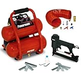 Product Description The Powermate VSP0000201 2 gallon portable air compressor is a light weight multi-function air compressor. Complete with 2-in-1 nail gun, collated nails, collated staples, hose, quick connects, plugs, and inflation accessories this unit comes ready to go right out of the box. Great For: Inflating lawn toys, tires, soccer and basket balls, clearing saw dust, running nail guns of all types, operating many air tools including some paint sprayers (check air tool cfm requirements). Paired with a 2-in-1 nail gun (included) this unit is great for fence repair, trim and crown